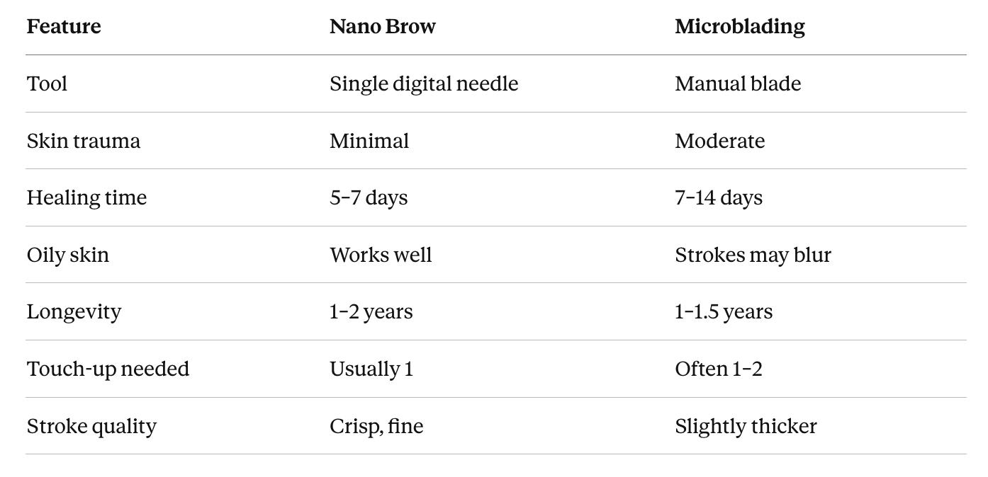 Unlike microblading — which uses a manual blade — nano brow is less invasive, heals faster, and produces crisper, longer-lasting lines. The technique works on all skin types, including oily and mature skin where microblading strokes tend to blur over time.